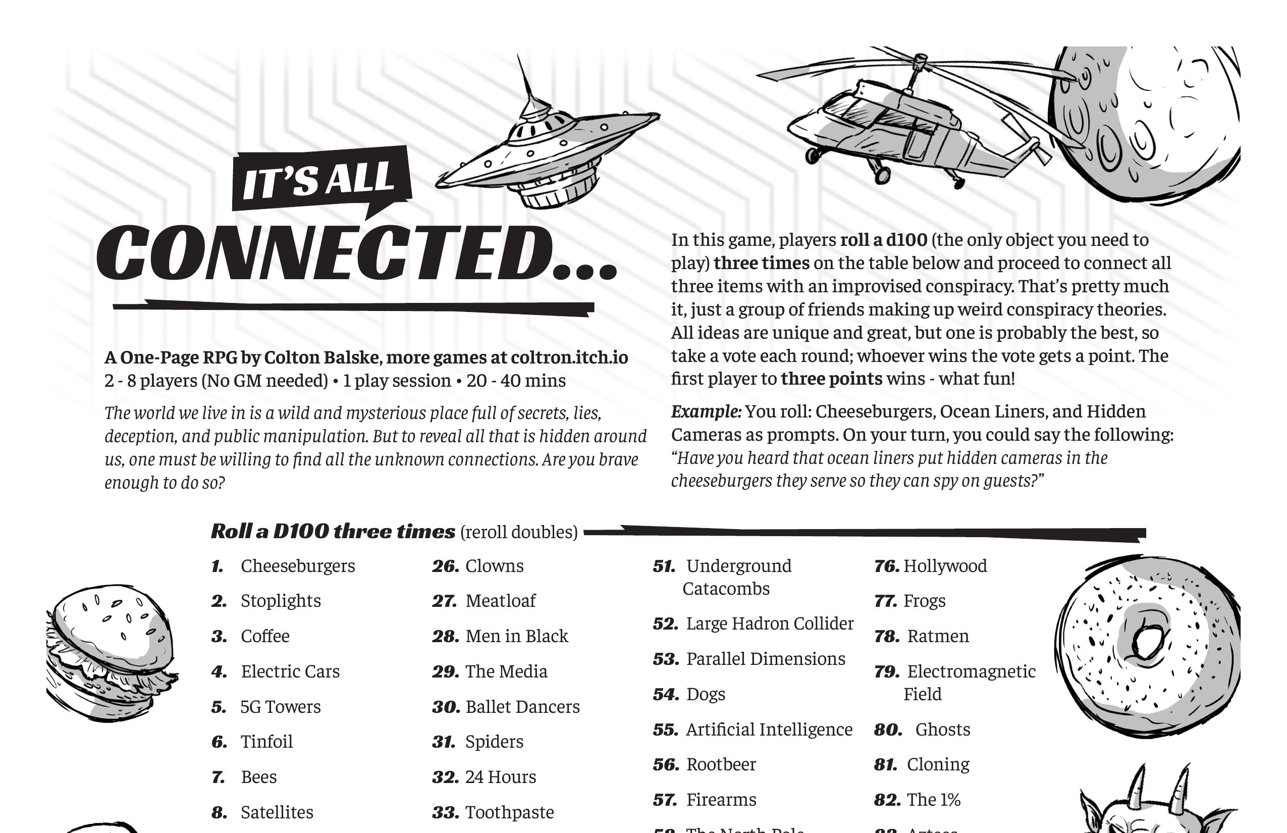 In this game, players roll a d100 (the only object you need to play) three times on the table below and proceed to connect all three items with an improvised conspiracy.